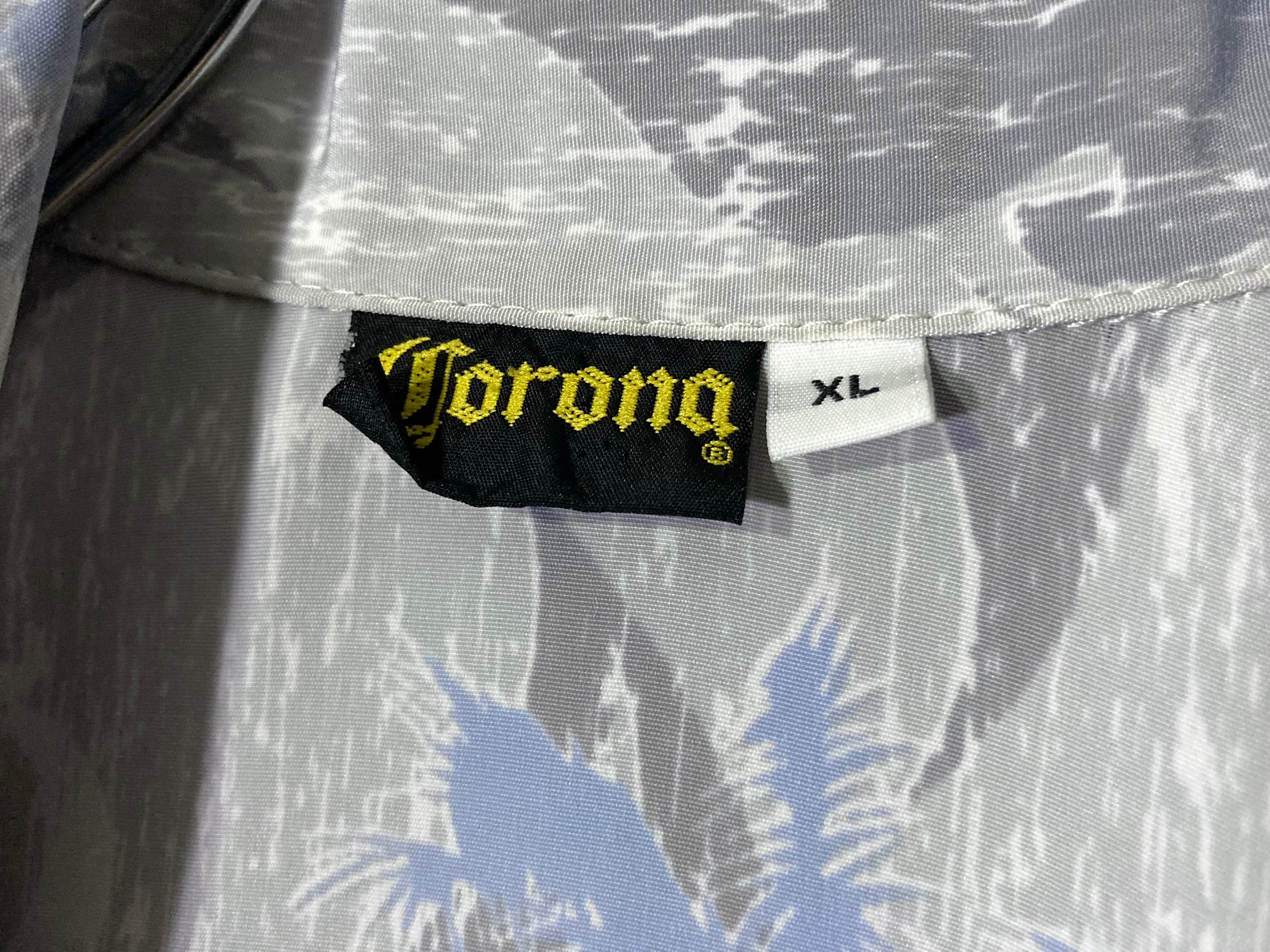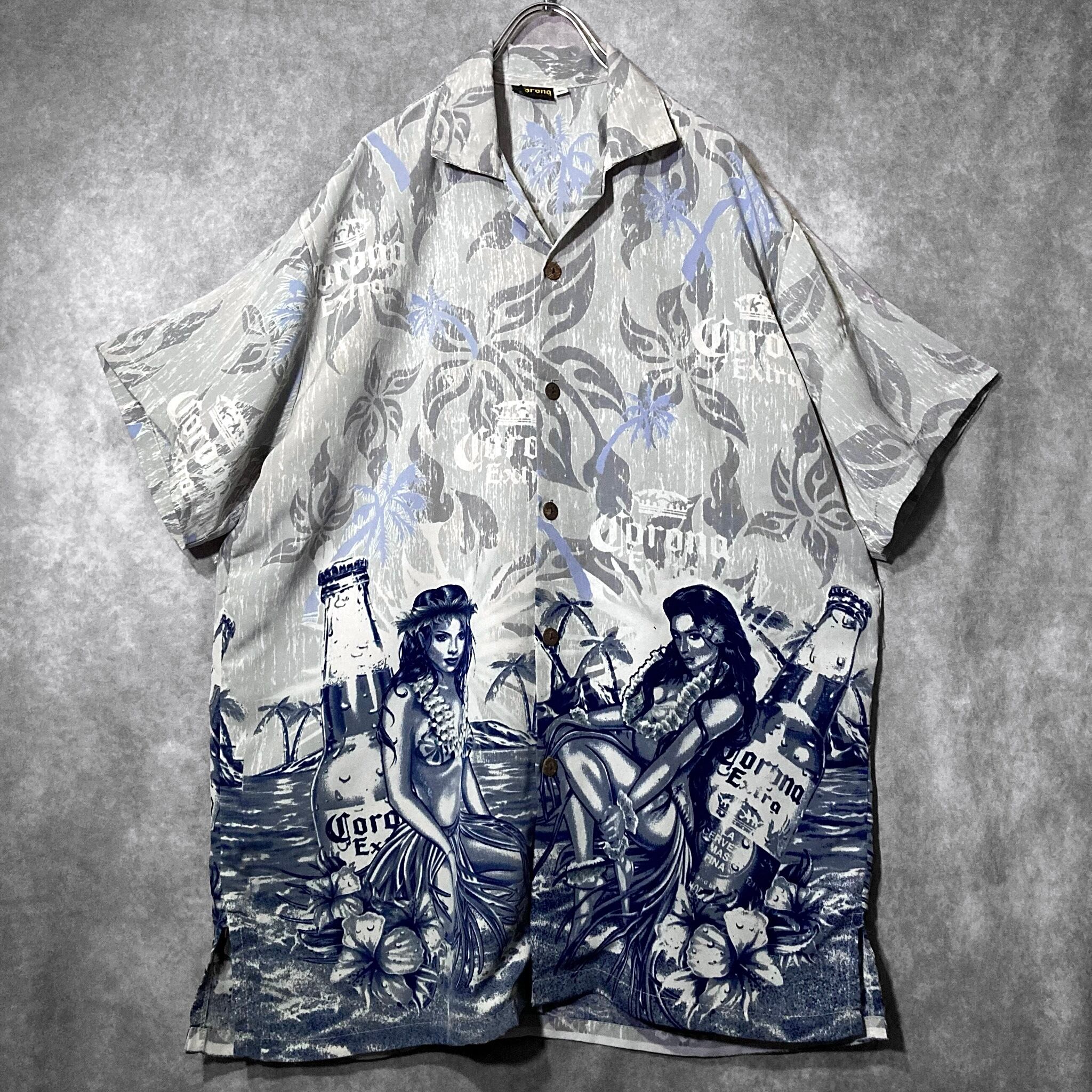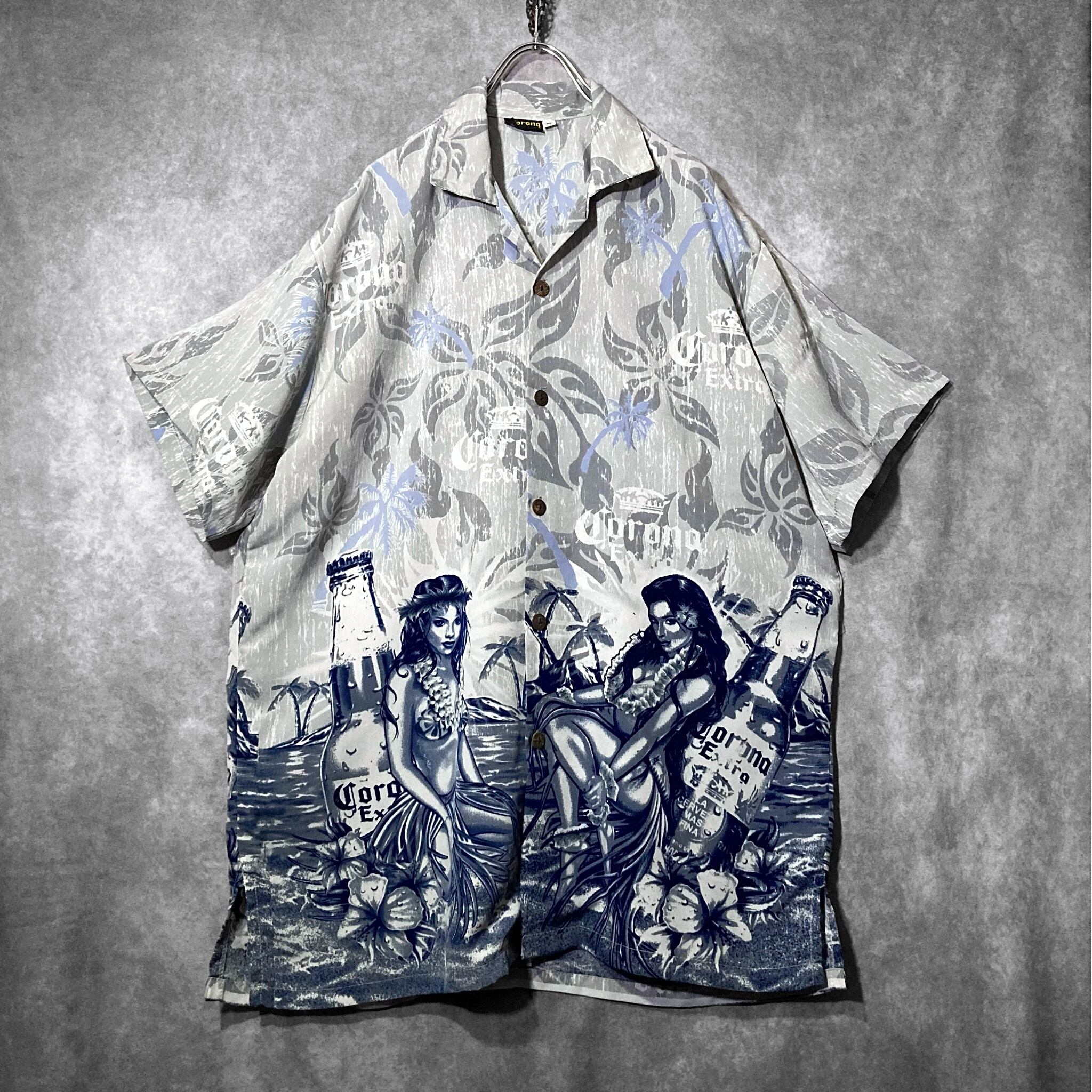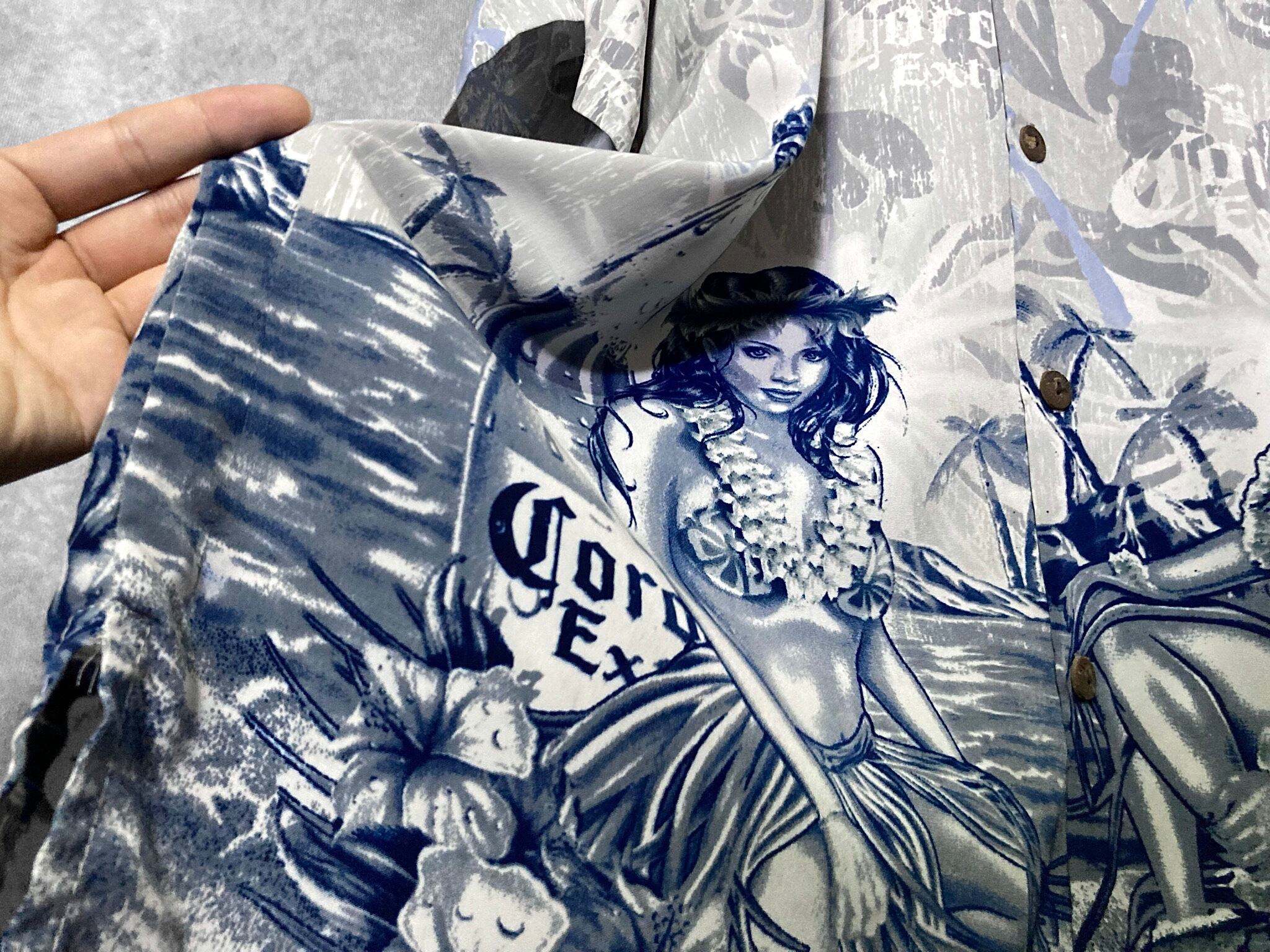 メキシコではメジャーのCorona Extra (コロナ・エキストラ) ビールと、もたれかかるsexyな美女が大胆にプリントされたオーバーサイズの花柄シャツ。