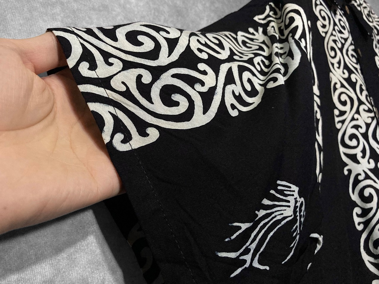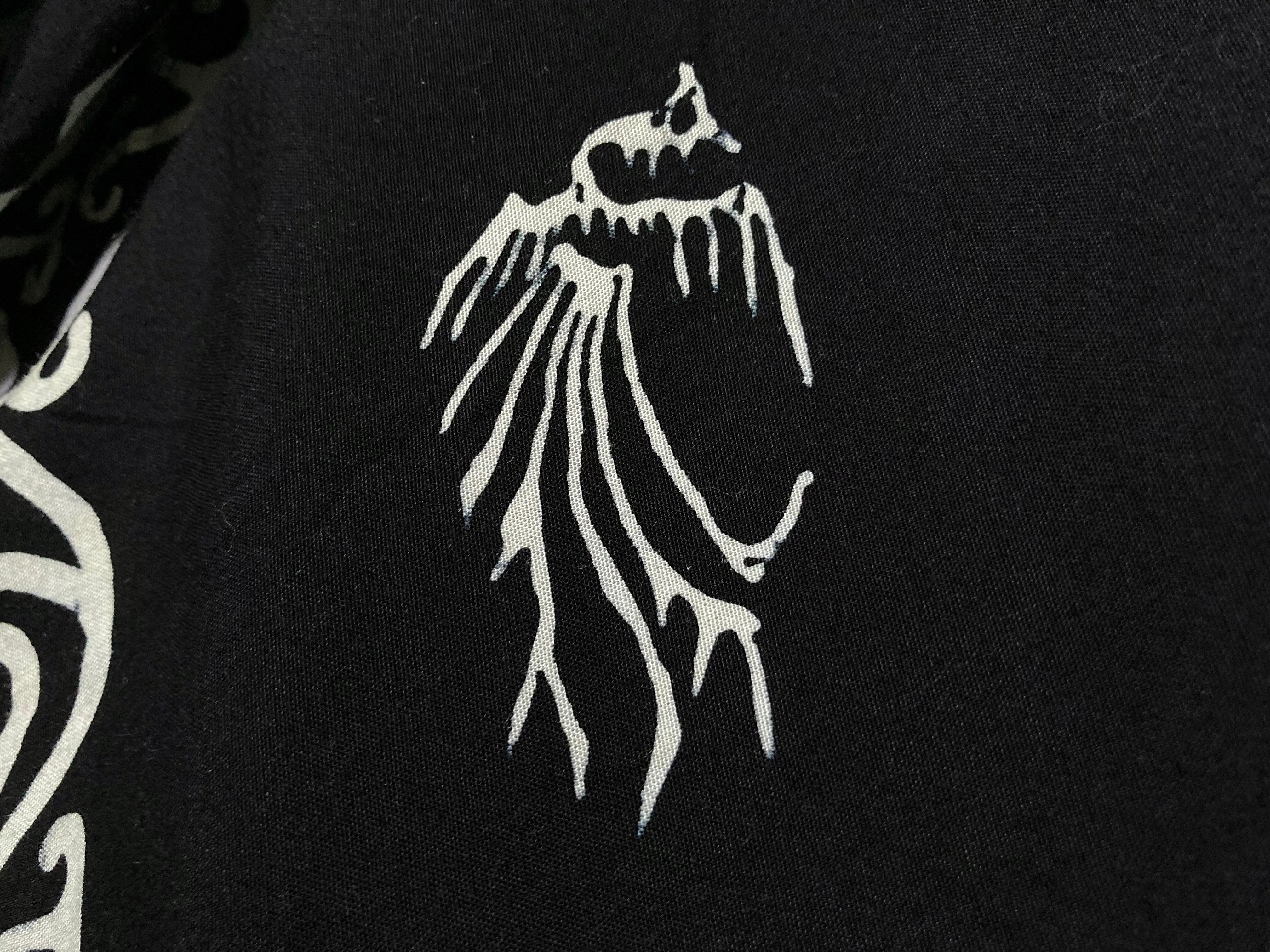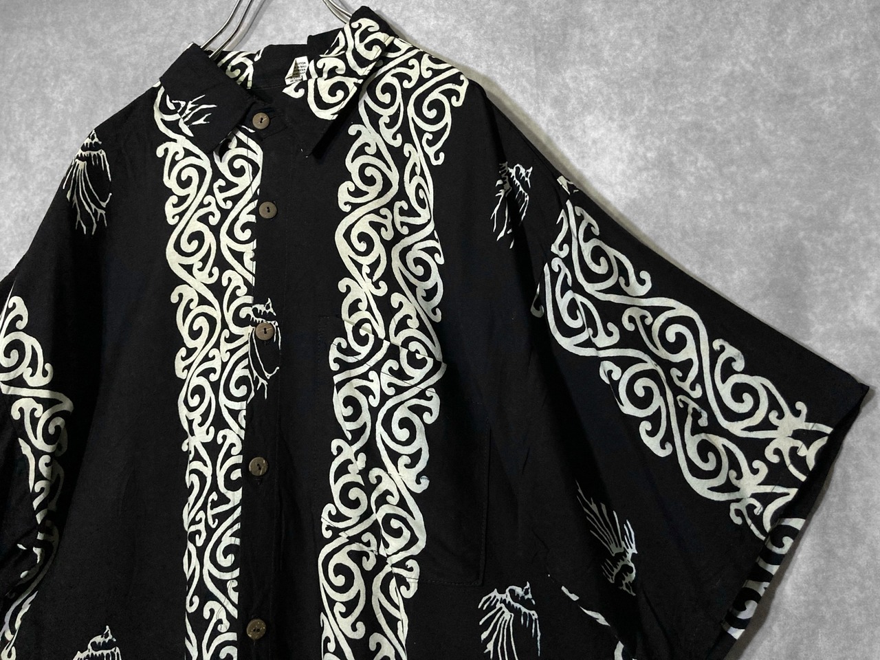黒と白のモノトーンなコントラストと唐草模様と造形文字のような魚柄が目をひく雰囲気ムンムンな黒モノシャツの入荷です ✔️