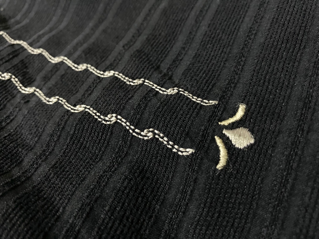 遠目から見ても光り輝くゴールドの太糸で施された細かい刺繍デザイン。