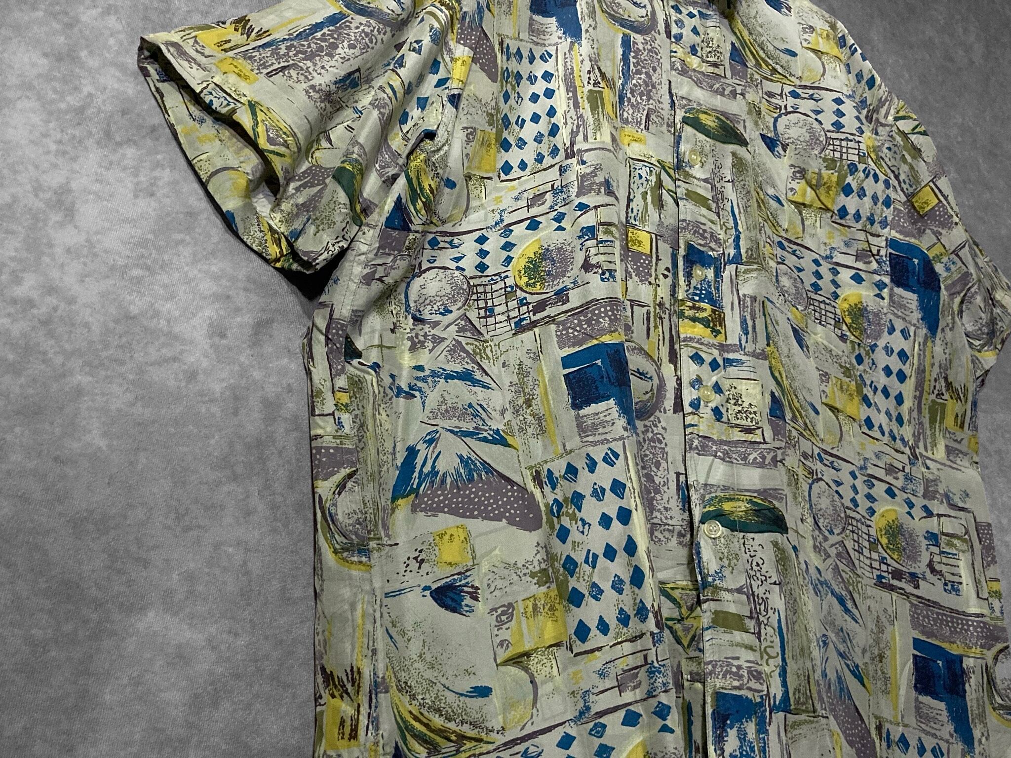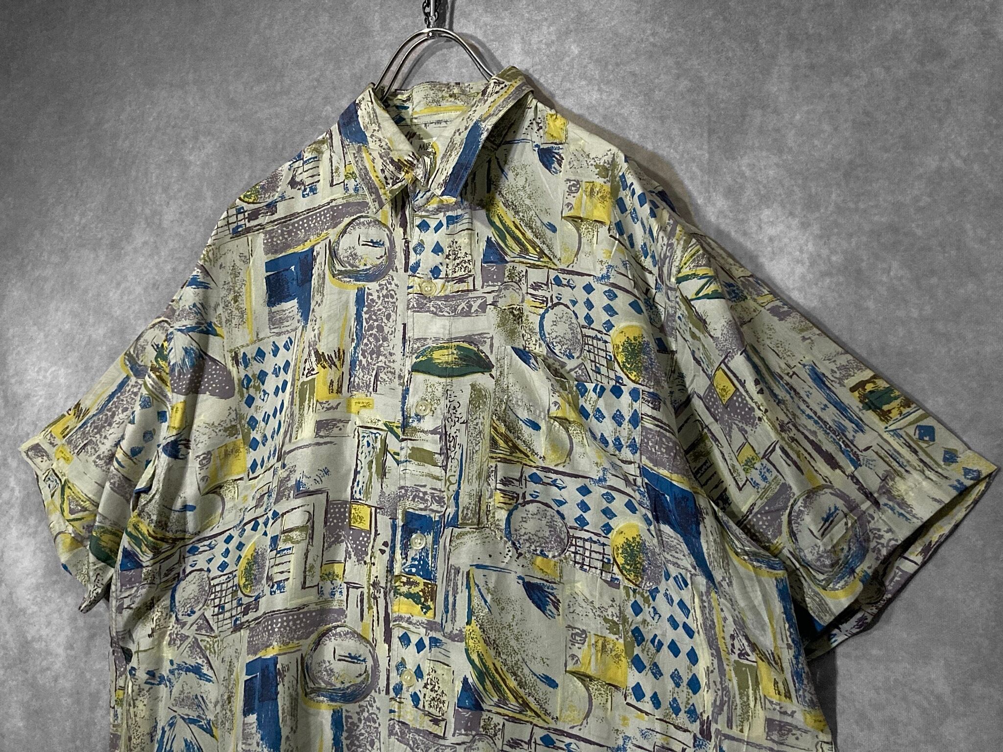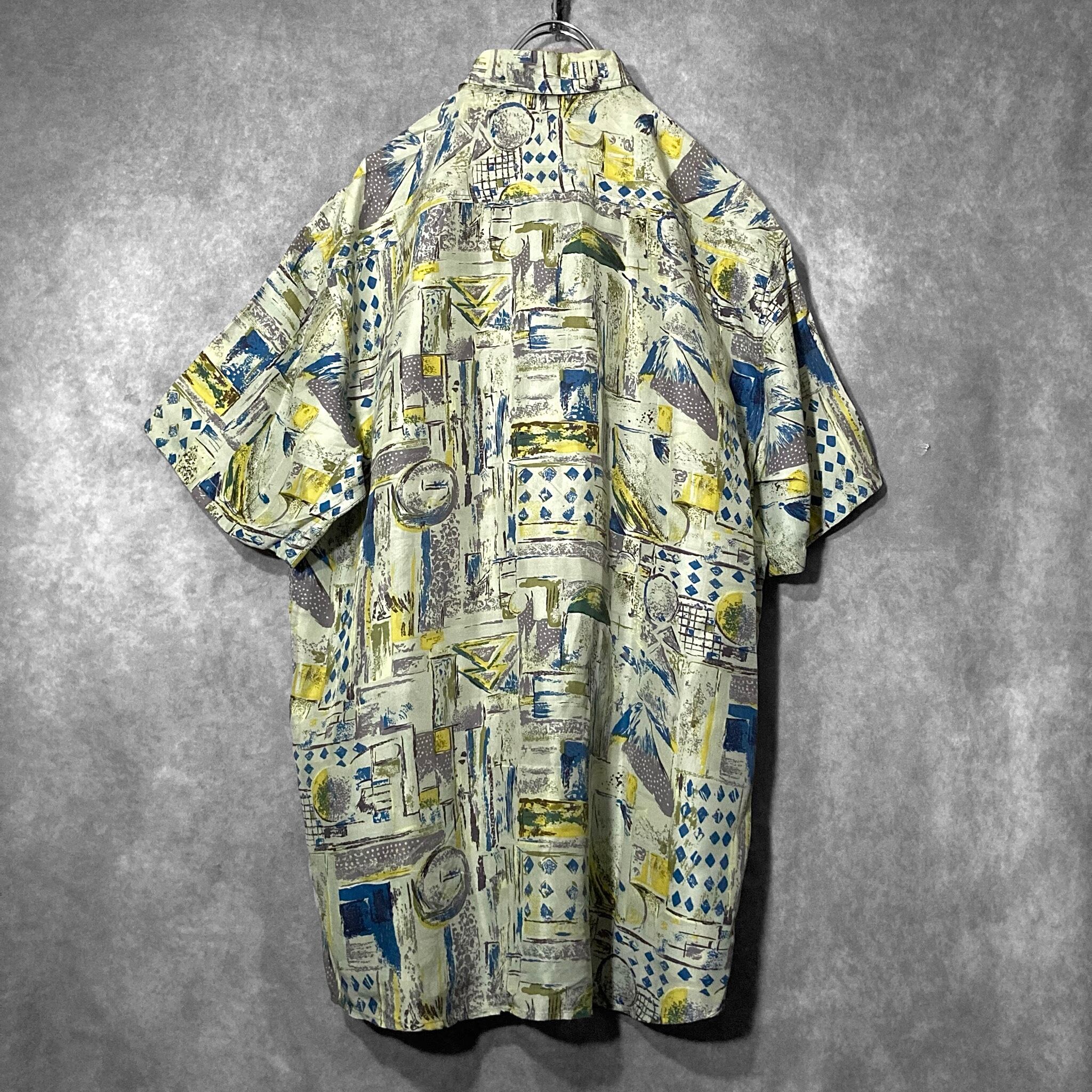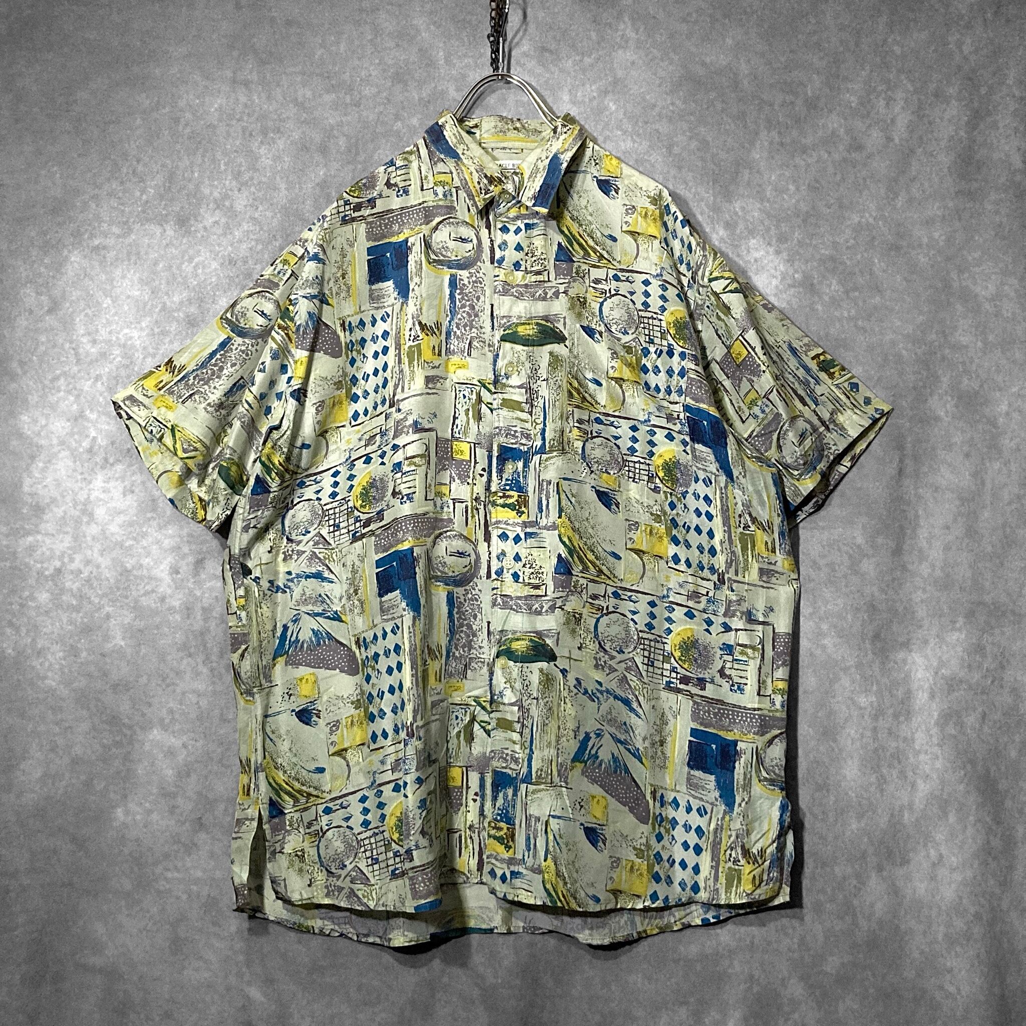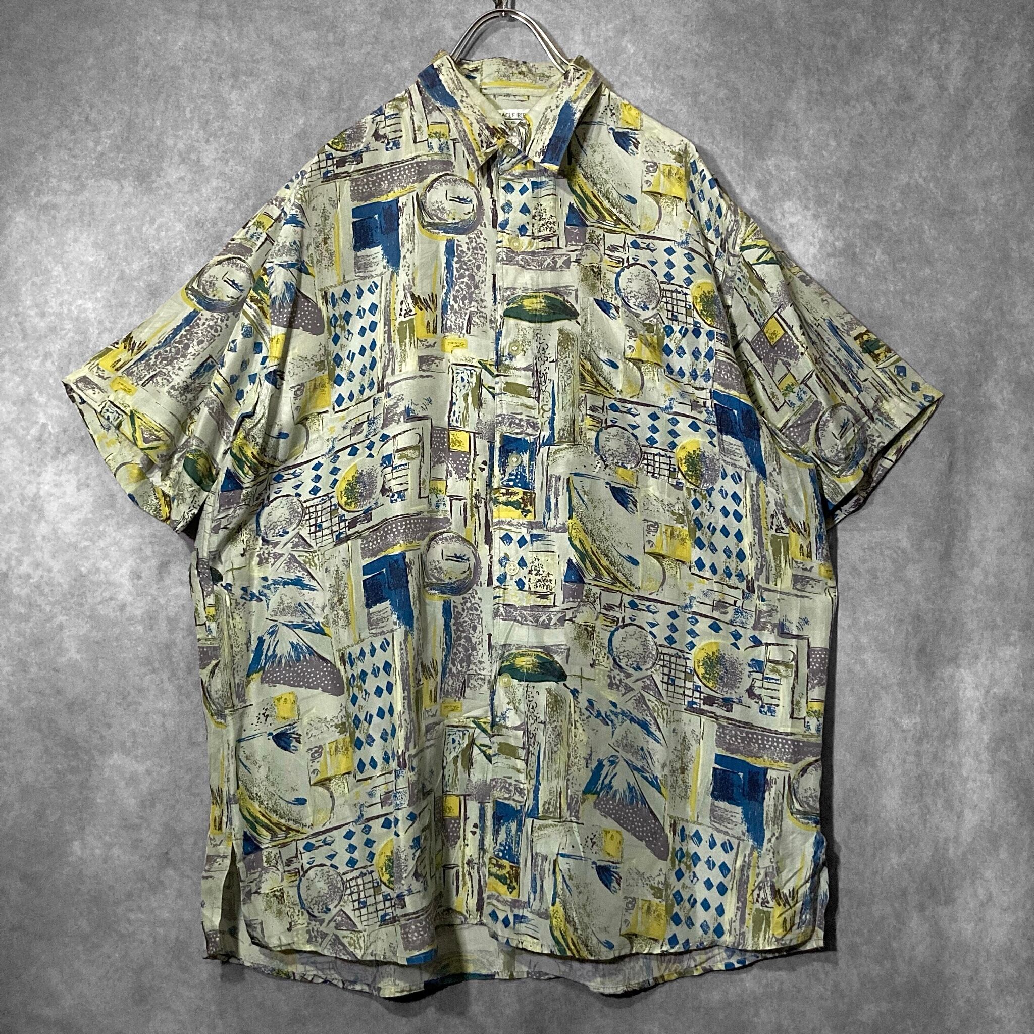 XXL 擦れ Hand drawn art all over pattern design Over-size silhouette silk S/S shirt