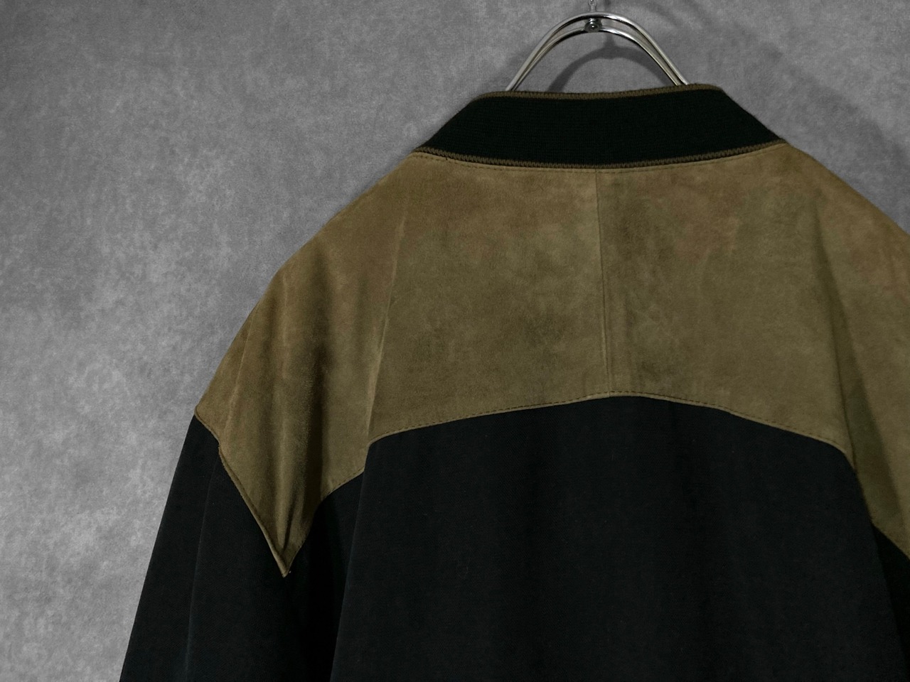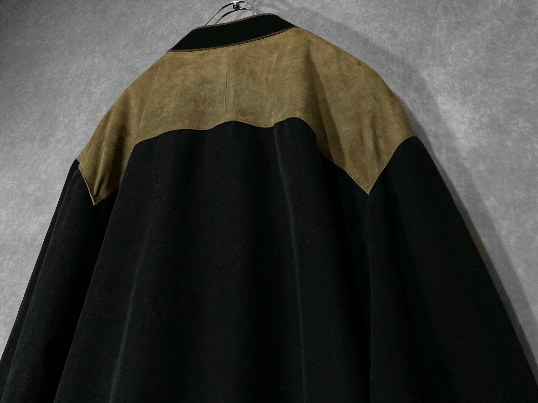 全体の主要生地にはウールをギャバジン織りしたウールギャバジンの生地になっており、上質なラムスキンを使用したスウェードレザーから裾に向かって伸びるニットのヨークのデザインが印象的。